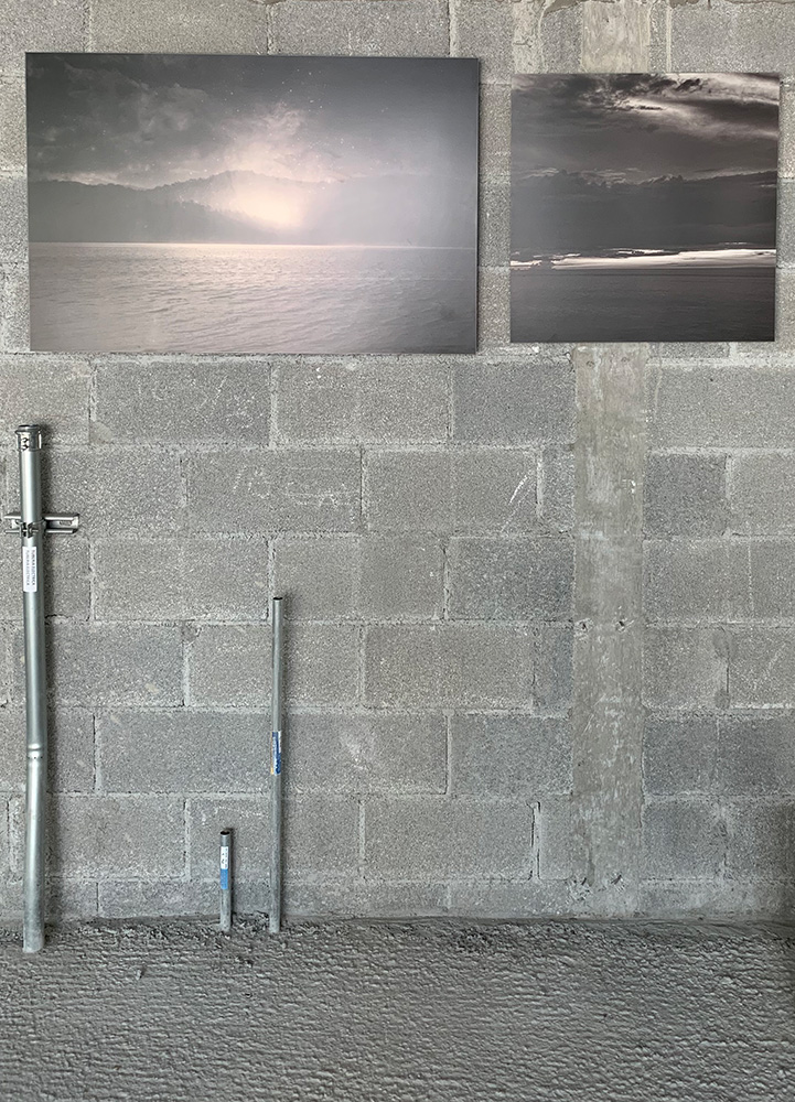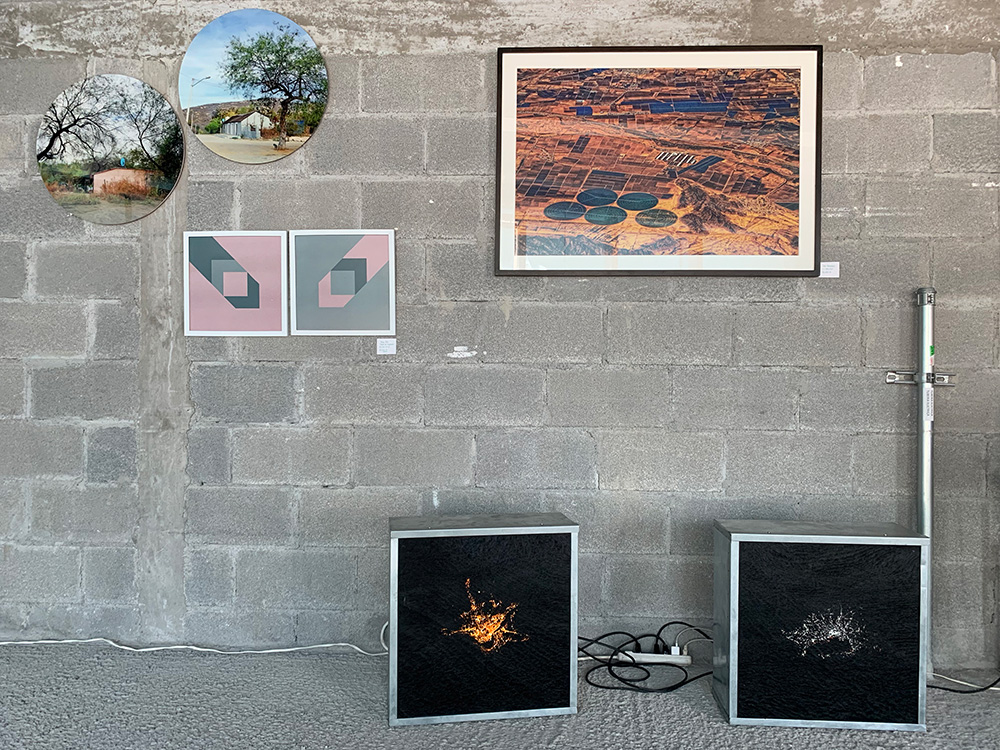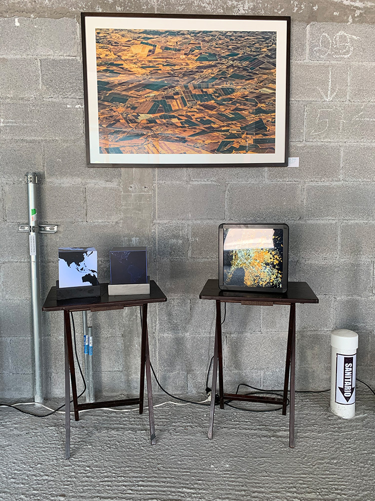 Las fotografías de Fernando Gallegos nos hablan de la huella que en el paisaje natural dejan los humanos; y no precisamente una huella conciliadora con su entorno, sino agresiva, extraña al mismo. Desechos que evidencian una desconexión total con su esencia. Gallegos la presenta desde lo específico, el encuentro inmediato con el vestigio, contraponiendo, pero continuando, con el trabajo de Iván Manríquez, donde se aprecia, desde lo general, desde una vista amplia, la intervención humana en el paisaje natural. Manríquez, en su caso, cual vuelo de ave que observa desde el cielo, nos hace partícipes de vastos campos tratados para cierto beneficio matérico cuestionable, extendiendo la idea a formas cúbicas que refieren al planeta Tierra en constante abrasión.