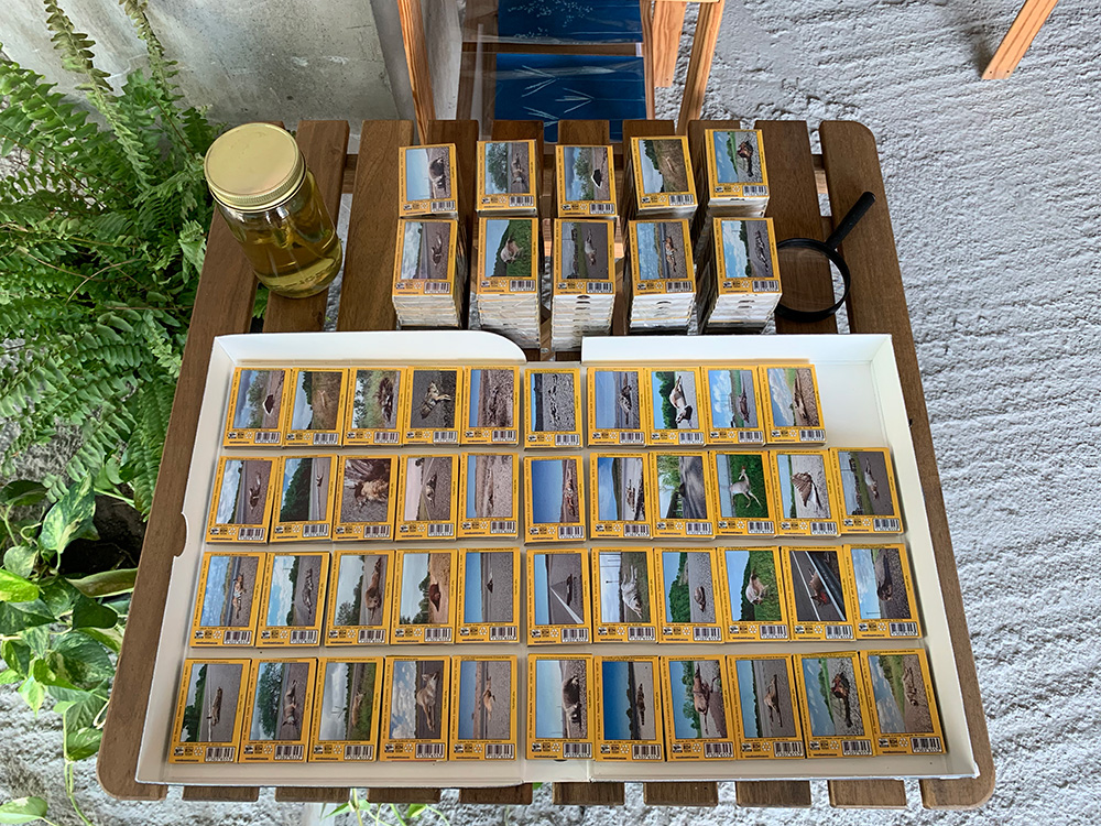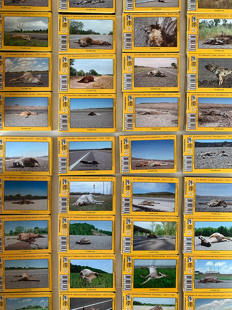 Así llegamos al trabajo del colectivo Esto Es Para Esto, en el que un conjunto de imágenes en movimiento, un tanto desalentadoras sobre el rumbo de la humanidad, nos conducen a un cuestionamiento acerca del imaginario contemporáneo con el consumo como existencia; imágenes que entran en diálogo con una caja de luz del artista Marcel del Castillo, en la que vemos una suposición de fotografías que nos muestran un panorama preocupante de la huella urbana en la que se habita en Monterrey y su área metropolitana. Estos acercamientos entre naturaleza y lo humano, que también podemos observar en las cajas de cerillos de Yolanda Leal (de una marca popular), a las que intervino con fotografías de animales muertos -lo más seguro atropellados-, a lado de carreteras, implican profundas preguntas sobre la condición del ser humano como ente que solo existe al manipular la naturaleza, últimamente en contra de esta.