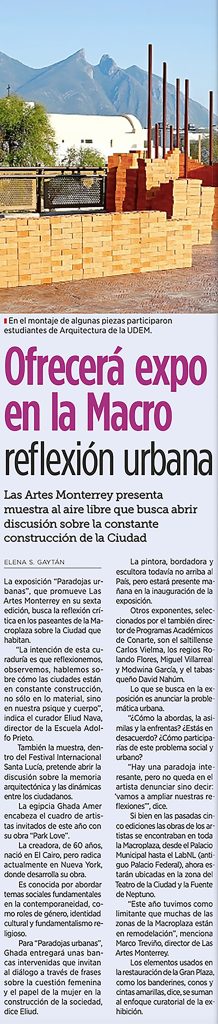 Nota de prensa: “INTERVIENEN LA MACRO PARADOJAS URBANAS”, publicada el sábado 30 de septiembre de 2023, en la sección Vida, del periódico El Norte.