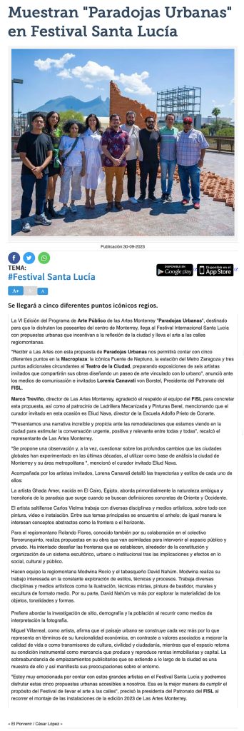 Nota de prensa: “MUESTRAN PARADOJAS URBANAS EN FESTIVAL SANTA LUCÍA”, publicada el sábado 30 de septiembre de 2023, en el periódico El Porvenir.