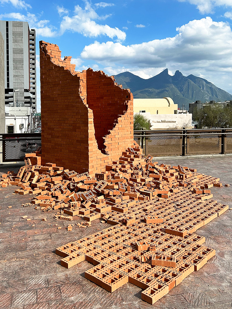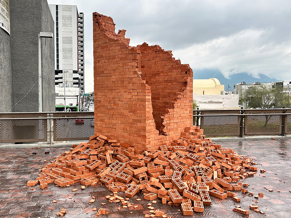 Regresando a la observación del paisaje urbano y rural en relación con el ladrillo, en la primera de estas variables, podemos determinar que el promedio de las ciudades latinoamericanas implica dimensionar un paisaje urbano y rural en constante autoconstrucción, en donde el deseo de concluir el espacio habitado se diluye entre desechos y montículos de escombros como el núcleo social mutante e inconcluso que lo genera; el contenedor de la memoria colectiva que se desmorona con el tiempo. Es aquí donde el ladrillo (la segunda de nuestras variables) se transforma en alegoría del muro que no termina de erigirse en la frontera de lo público y lo privado, en el horizonte del paisaje urbano que se percibe inacabado y en ruinas.