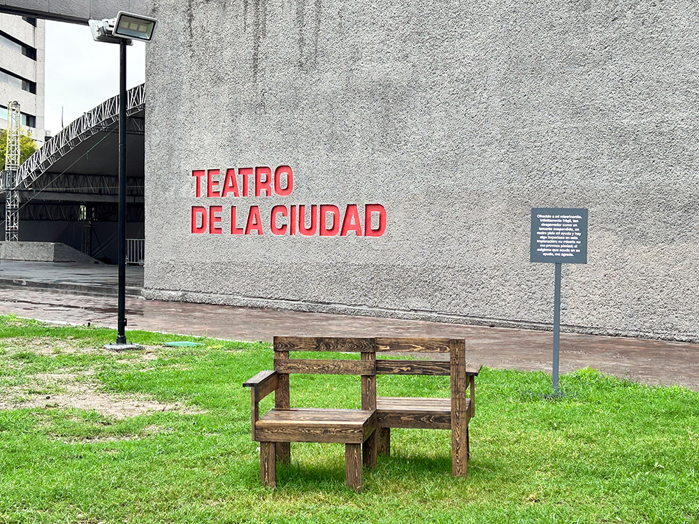 Bancas de madera intervenidas y letreros, ubicadas en diversas áreas entre la Fuente de Neptuno y la explanada enfrente del Teatro de la Ciudad | CONARTE. Medidas variables.