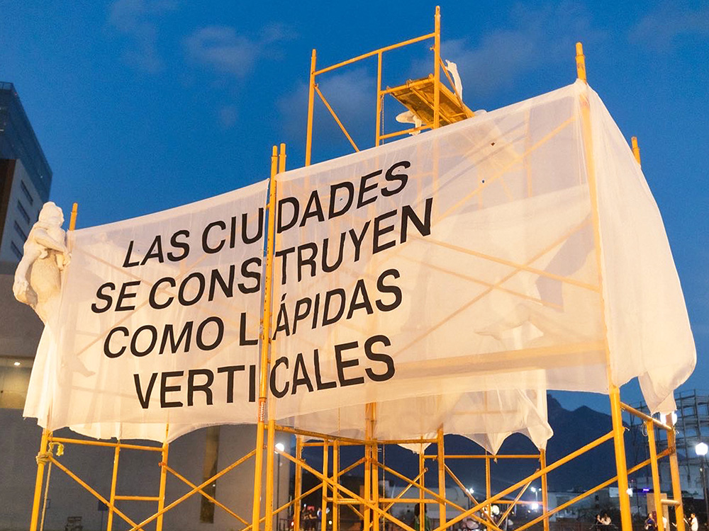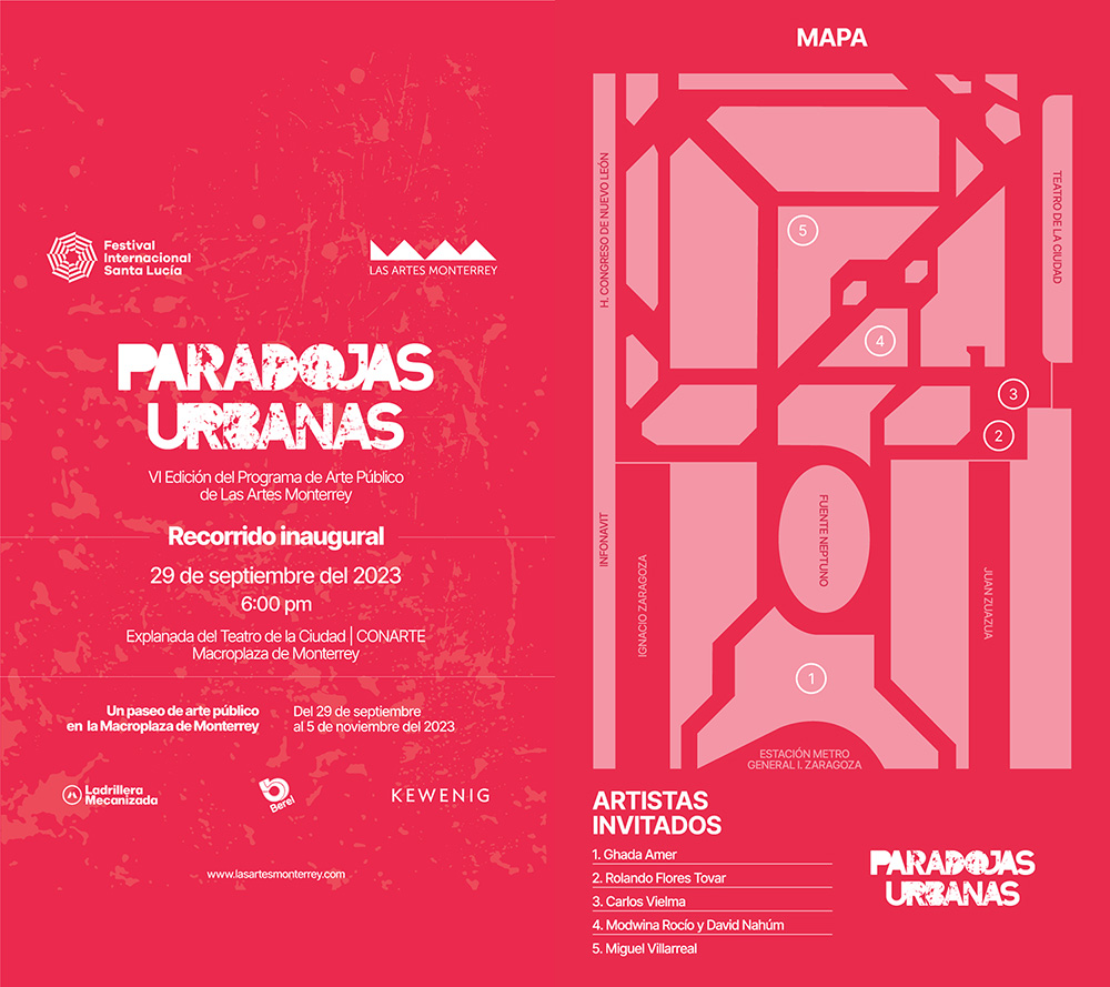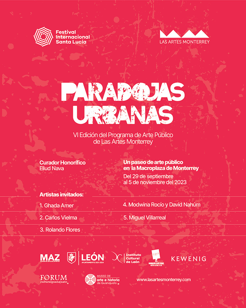 Pensar el paisaje urbano, la memoria arquitectónica, las dinámicas socioeconómicas, la condición de género, el imaginario histórico cultural y las relaciones interpersonales dentro de la globalización, entre otros temas y aspectos que presuponen la configuración de las sociedades contemporáneas en las que habitamos, se establece como el discurso narrativo curatorial filtrado en el conjunto de las instalaciones artísticas que componen «Paradojas Urbanas», la VI Edición del Programa de Arte Público de Las Artes Monterrey para el Festival Internacional Santa Lucía 2023.