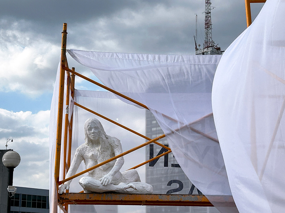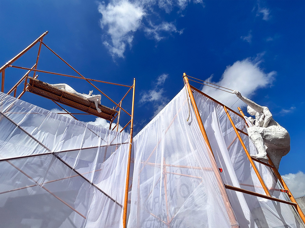 Instalación compuesta por estructuras de andamios, telas y esculturas de yeso reforzado, ubicada en la explanada enfrente del Teatro de la Ciudad | CONARTE. Las esculturas tienen medidas variables. La instalación completa de 6 x 5 x 3 metros.