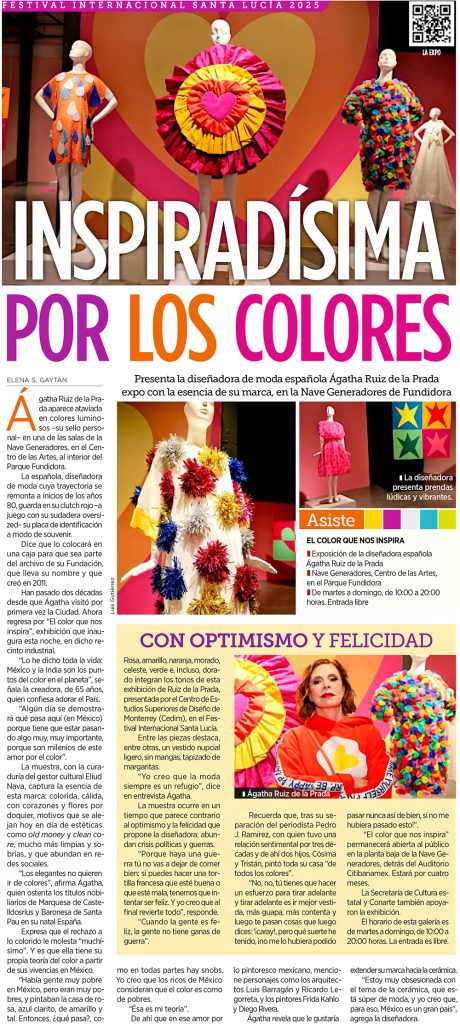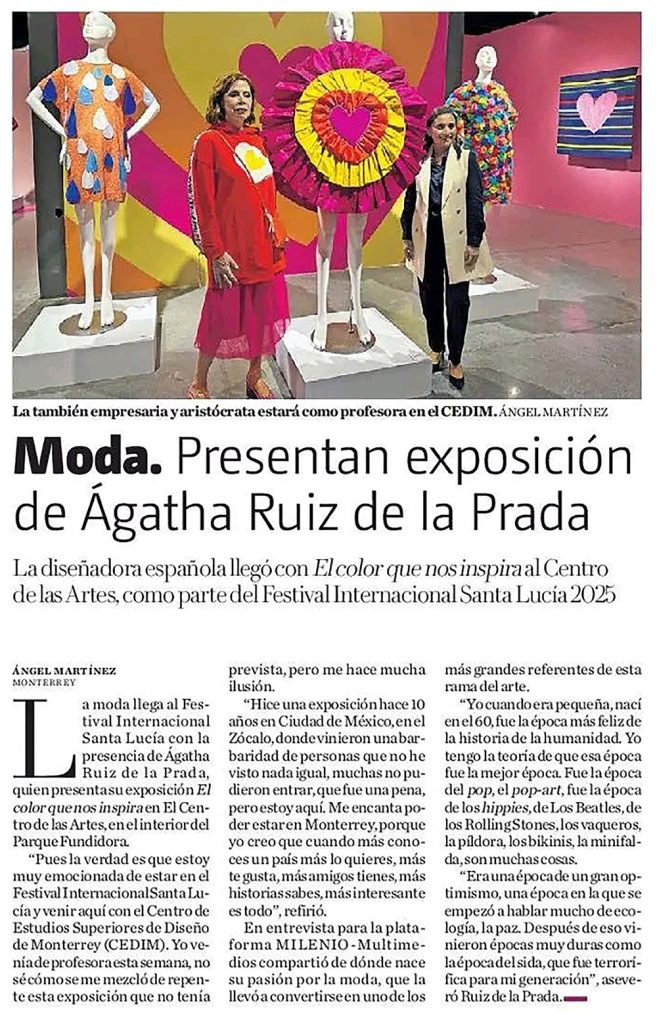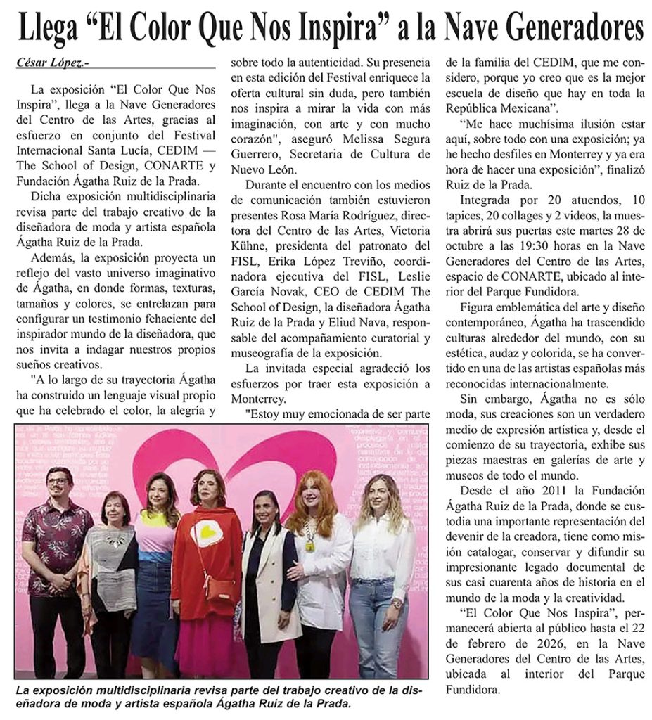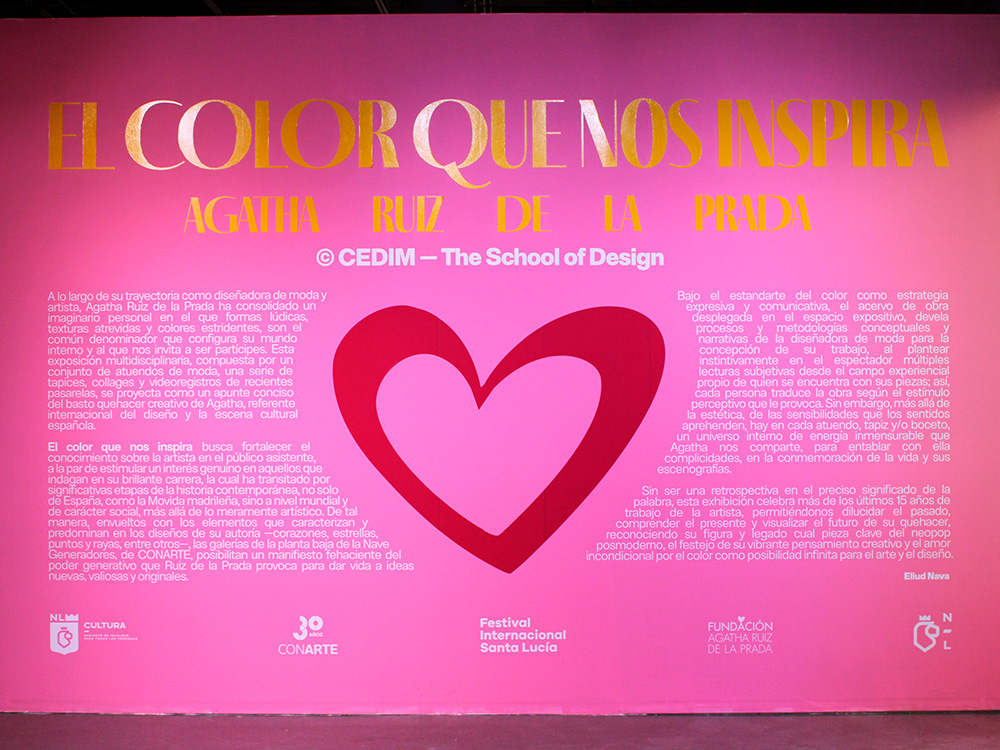 Exposición de Agatha Ruiz de la Prada para CEDIM – The School of Design, en el marco de actividades del Festival Internacional Santa Lucía 2025, con el apoyo de Fundación Agatha Ruiz de la Prada, CONARTE y Secretaría de Cultura de Nuevo León. Nave Generadores, del Centro de las Artes, CONARTE. Monterrey, Nuevo León, México. Del 28 de octubre de 2025 al 22 de febrero de 2026.